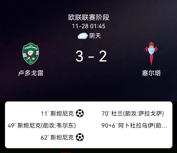 北京时间11月28日,欧足联欧洲联赛联赛阶段第5轮,卢多戈雷茨主场对阵塞尔塔。第11分钟斯塔尼奇点射,1-0;第49分钟斯塔尼奇破门,2-0;第62分钟斯塔尼奇再点射,3-0;第70分钟巴勃罗-杜兰破门,3-1;第96分钟阿卜杜勒拉维破门,3-2;卢多戈雷茨2张黄牌,塞尔塔3张黄牌。最终比分,卢多戈雷茨3-2塞尔塔。