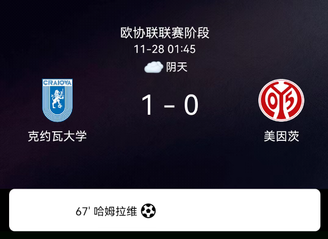 北京时间11月28日,欧洲协会联赛联赛阶段第4轮,克拉约瓦大学主场对阵美因茨。第67分钟哈姆拉维点射破门,1-0;双方均无红黄牌。最终比分,克拉约瓦大学1-0美因茨。