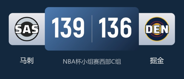然而,末节比赛进入白热化阶段,双方连续在外线上演对飙好戏,比分交替领先,比赛悬念十足。关键时刻,马刺队的瓦塞尔挺身而出,连续命中两记三分球,帮助球队建立起6分的领先优势。掘金队虽拼尽全力发起最后的追赶,但未能实现反超。最终,马刺队以139-136在客场逆转掘金队,成功晋级NBA杯8强。