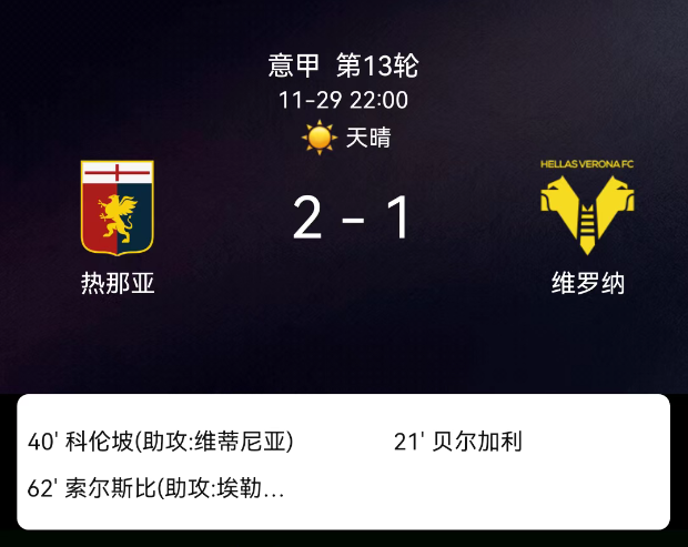 北京时间11月29日,意大利足球甲级联赛第13轮,热那亚主场对阵维罗纳。第21分钟拉菲克-贝尔加利破门,0-1;第40分钟洛伦佐-科隆博破门,1-1;第62分钟托斯比破门,2-1;热那亚1张黄牌,维罗纳3张黄牌,无红牌。最终比分,热那亚2-1维罗纳。