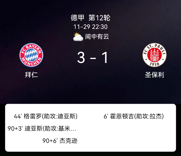 北京时间11月29日,德国足球甲级联赛第12轮,拜仁慕尼黑主场对阵圣保利。第6分钟洪通吉破门,0-1;第44分钟格雷罗破门,1-1;第90+3分钟迪亚斯破门,2-1;第90+7分钟雅克松破门,3-1;拜仁1张黄牌,圣保利1张黄牌,无红牌。最终比分,拜仁慕尼黑3-1圣保利。