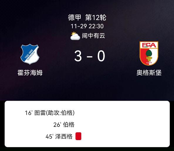 北京时间11月29日,2023-2024赛季德国足球甲级联赛第12轮,霍芬海姆主场对阵奥格斯堡。第16分钟巴祖马纳-杜尔破门,1-0;第26分钟布格尔破门,2-0;第45分钟泽西格尔自摆乌龙,3-0;双方均无红黄牌。最终比分,霍芬海姆3-0奥格斯堡。