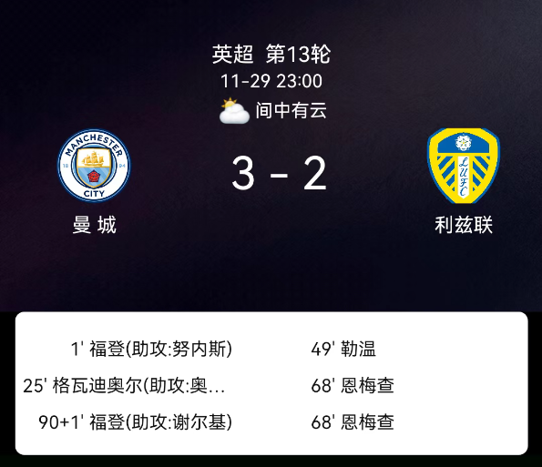 北京时间11月29日23:00,英格兰足球超级联赛第13轮,曼城主场对阵利兹联。第1分钟福登破门,1-0;第25分钟格瓦迪奥尔破门,2-0;第49分钟卡尔弗特-勒温破门,2-1;第68分钟卢卡斯-恩梅加破门,2-2;第90+1分钟福登破门,3-2;曼城2张黄牌,利兹联无红黄牌。最终比分,曼城3-2利兹联。