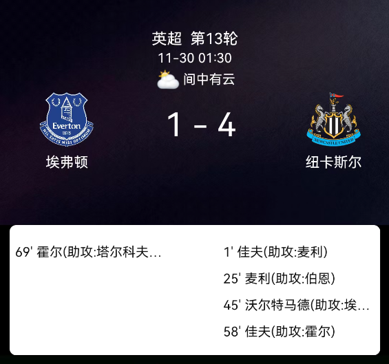北京时间11月30日,英格兰足球超级联赛第13轮,埃弗顿主场对阵纽卡斯尔联。第1分钟马利克-佳夫破门,0-1;第25分钟刘易斯-米利破门,0-2;第45分钟沃尔特马德破门,0-3;第58分钟马利克-佳夫再破门,0-4;第69分钟迪尤斯伯里-霍尔破门,1-4;双方均无红黄牌。最终比分,埃弗顿1-4纽卡斯尔联。