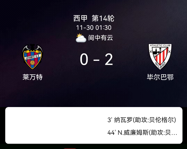 北京时间11月30日,西班牙足球甲级联赛第14轮,莱万特主场对阵毕尔巴鄂竞技。第3分钟罗伯特-纳瓦罗破门,0-1;第32分钟莱万特染黄;第37分钟莱万特再染黄;第40分钟毕尔巴鄂竞技染黄;第44分钟尼科-威廉斯破门,0-2;第51分钟毕尔巴鄂竞技再染黄;第86分钟莱万特三染黄;无红牌。最终比分,莱万特0-2毕尔巴鄂竞技。