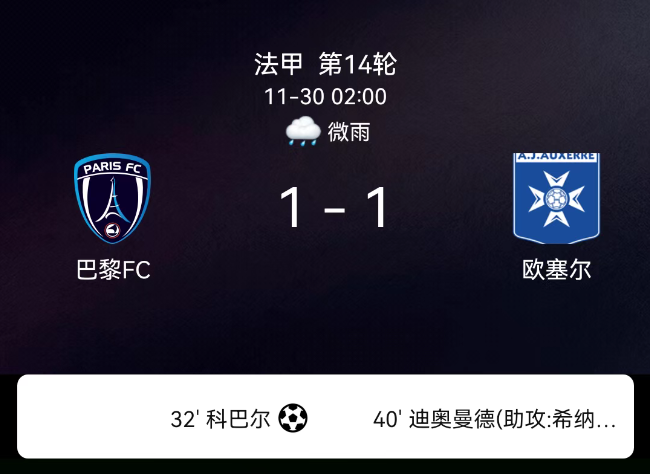 北京时间11月30日,法国足球甲级联赛第14轮,巴黎FC主场对阵欧塞尔。第32分钟凯巴尔点射,1-0;第40分钟迪奥曼德破门,1-1;双方均无红黄牌。最终比分,巴黎FC1-1欧塞尔。