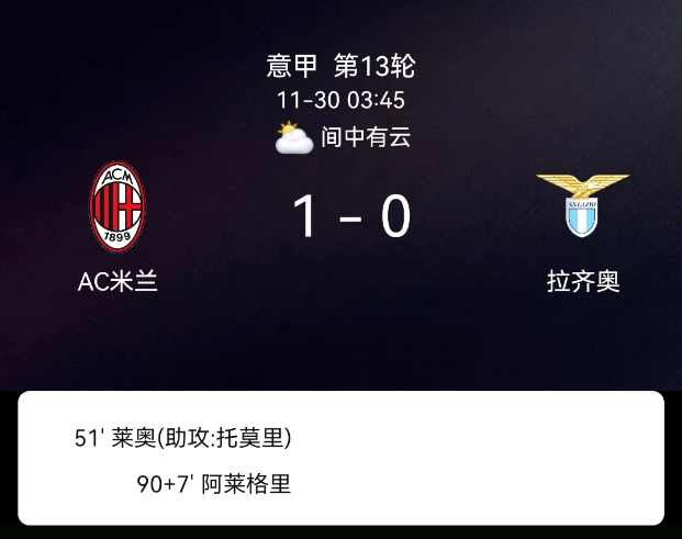 北京时间11月30日,意大利足球甲级联赛第13轮,AC米兰主场对阵拉齐奥。第27分钟托莫里染黄;第52分钟莱奥破门,1-0;第74分钟罗马尼奥利染黄;第90+8分钟阿莱格里直红;最终比分,AC米兰1-0拉齐奥。