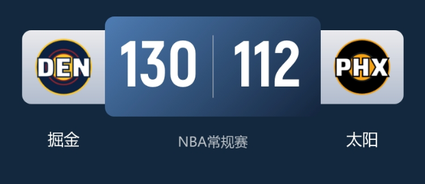 NBA战报:掘金130-112轻取太阳拒绝连败约基奇26+9+10准三双统治全场