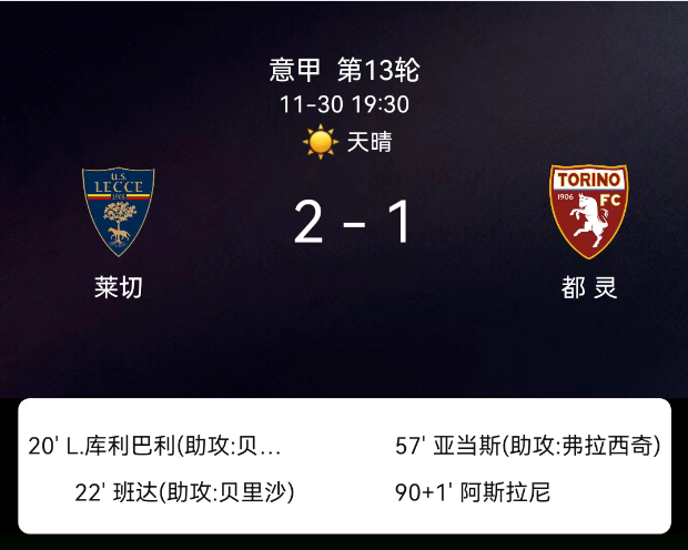 北京时间11月30日,意大利足球甲级联赛第13轮,莱切主场对阵都灵。第20分钟拉萨纳-库利巴利破门,1-0;第22分钟班达破门,2-0;第57分钟切-亚当斯破门,2-1;莱切2张黄牌、都灵3张黄牌;无红牌。最终比分,莱切2-1都灵。