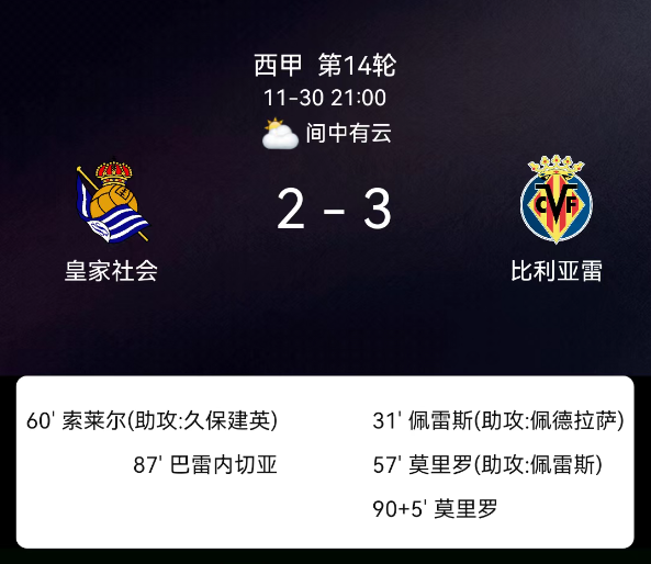 北京时间11月30日,西班牙足球甲级联赛第14轮,皇家社会主场对阵比利亚雷亚尔。第20分钟比利亚雷亚尔染黄;第31分钟阿约塞-佩雷斯破门,0-1;第57分钟莫莱罗破门,0-2;第60分钟索莱尔破门,1-2;第87分钟巴雷内切亚破门,2-2;第90+5分钟莫莱罗破门,2-3;仅1张黄牌无红牌。最终比分,皇家社会2-3比利亚雷亚尔。