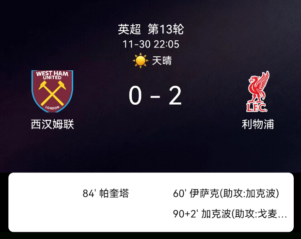 北京时间11月30日,英格兰足球超级联赛第13轮,西汉姆联主场对阵利物浦。第66分钟马加萨染黄;第60分钟伊萨克破门,0-1;第84分钟帕奎塔两黄变一红;第90+2分钟加克波破门,0-2;仅1张黄牌1张红牌。最终比分,西汉姆联0-2利物浦。