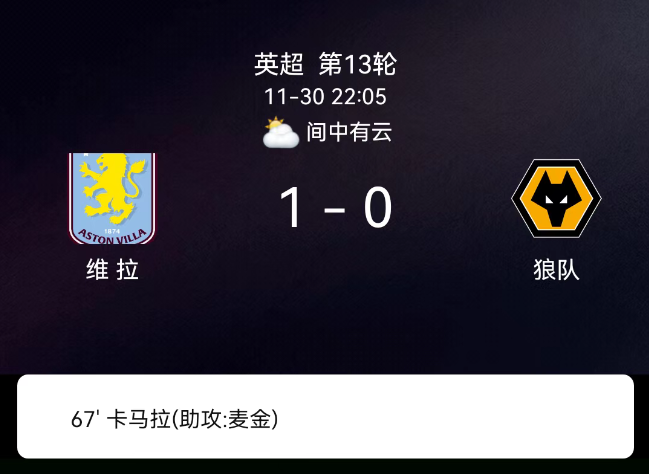 北京时间11月30日,英格兰足球超级联赛第13轮,阿斯顿维拉主场对阵狼队。第45+2分钟狼队染黄;第68分钟卡马拉破门,1-0;第78分钟狼队再染黄;狼队累计4张黄牌无红牌。最终比分,阿斯顿维拉1-0狼队。