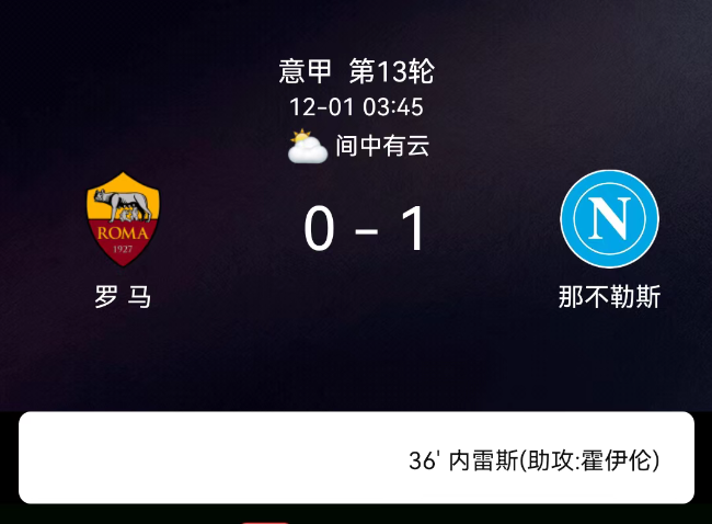 北京时间12月1日,意大利足球甲级联赛第13轮,罗马主场对阵那不勒斯。第36分钟内雷斯破门,0-1;罗马4黄、那不勒斯3黄;无红牌。最终比分,罗马0-1那不勒斯。