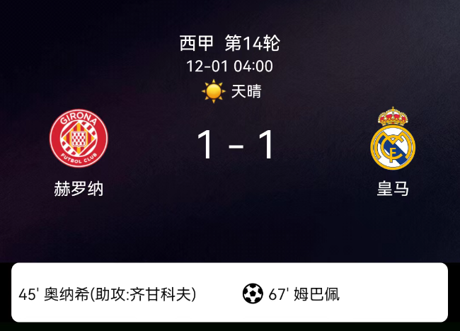 北京时间12月1日,西班牙足球甲级联赛第14轮,赫罗纳主场对阵皇家马德里。第42分钟赫罗纳染黄;第45分钟欧纳希破门,1-0;第59分钟欧纳希染黄;第67分钟姆巴佩点射,1-1;第74分钟瓦纳特染黄;赫罗纳3黄、皇马无牌。最终比分,赫罗纳1-1皇家马德里。