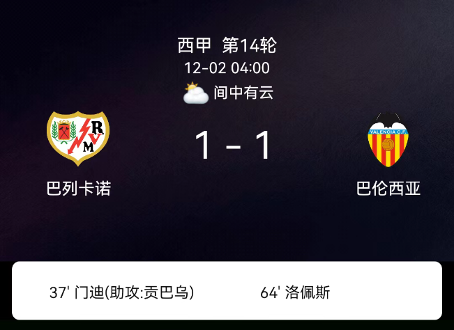 北京时间12月2日,西班牙足球甲级联赛第14轮,巴列卡诺主场对阵瓦伦西亚。第37分钟诺贝尔-门迪破门,1-0;第51分钟巴列卡诺染黄;第64分钟迭戈-洛佩斯破门,1-1;第89分钟瓦伦西亚染黄;双方各1黄;无红牌。最终比分,巴列卡诺1-1瓦伦西亚。