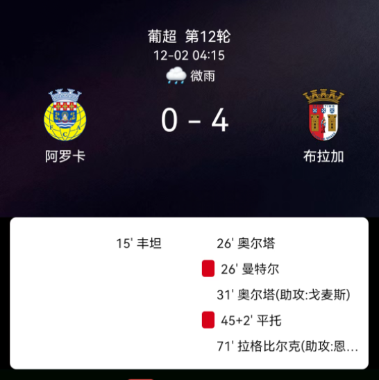 北京时间12月2日,葡萄牙足球超级联赛第12轮,阿罗卡主场对阵布拉加。第13分钟阿罗卡染黄;第15分钟丰坦两黄变一红;第26分钟曼特尔自摆乌龙,0-1;第31分钟里卡多-奥尔塔破门,0-2;第45+2分钟阿莱士-平托自摆乌龙,0-3;第71分钟拉格比耶尔克破门,0-4;第84分钟阿罗卡再染黄;阿罗卡1红2黄、布拉加无牌。最终比分,阿罗卡0-4布拉加。