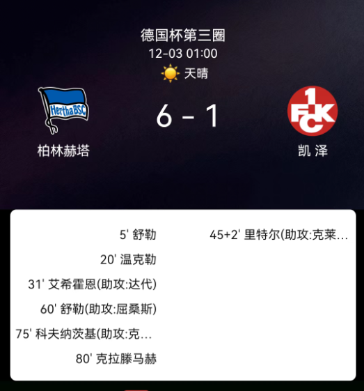 北京时间12月3日,德国足协杯第三轮,柏林赫塔对阵凯泽斯劳滕。第5分钟舒勒破门,1-0;第20分钟温克勒破门,2-0;第31分钟肯尼特-艾希霍恩破门,3-0;第45+2分钟里特破门,3-1;第60分钟舒勒再破门,4-1;第75分钟科夫纳茨基破门,5-1;第80分钟克拉滕马赫破门,6-1;双方无红黄牌。最终比分,柏林赫塔6-1凯泽斯劳滕。