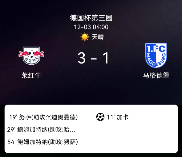 北京时间12月3日,德国足协杯第三轮,RB莱比锡对阵马格德堡。第8分钟马格德堡染黄;第11分钟格纳卡点射,0-1;第19分钟努萨破门,1-1;第20分钟莱比锡染黄;第21分钟马格德堡再染黄;第29分钟鲍姆加特纳破门,2-1;第39分钟马格德堡三黄;第54分钟鲍姆加特纳再破门,3-1;第90+1分钟马克西莫维奇破门被判越位;莱比锡1黄、马格德堡3黄;无红牌。最终比分,RB莱比锡3-1马格德堡。