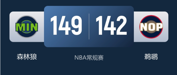 末节决战,两队陷入艰苦拉锯,比分交替上升。终场前关键时刻,爱德华兹挺身而出,命中关键上篮将比分绝平;鹈鹕队的奎因执行最后一攻绝杀未果,比赛进入加时。加时赛中,常规时间低迷的兰德尔突然爆发,连续单打得手,带领森林狼队打出一波8-0的决定性攻势确立胜势。最终,森林狼队以149-142击败鹈鹕队,豪取3连胜,同时送给对手4连败。