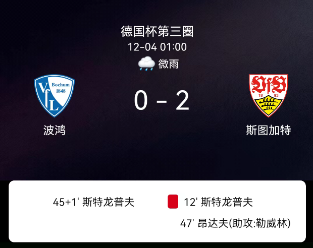 北京时间12月4日,德国足协杯第三轮,波鸿主场对阵斯图加特。第12分钟施特龙普夫乌龙,0-1;第45+1分钟施特龙普夫直红;第47分钟昂达夫破门,0-2;双方无黄牌。最终比分,波鸿0-2斯图加特。