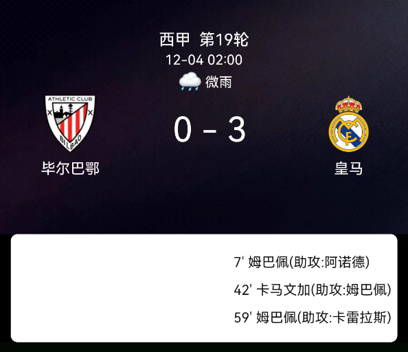 北京时间12月4日2:00,2025-2026赛季西甲第19轮,皇家马德里客战毕尔巴鄂竞技。第7分钟姆巴佩破门,1-0;第42分钟卡马文加破门,2-0;第59分钟姆巴佩再破门,3-0;第66分钟毕尔巴鄂首染黄;第76分钟莫拉染黄;毕尔巴鄂2黄、皇马无牌;无红牌。最终比分,毕尔巴鄂竞技0-3皇家马德里。