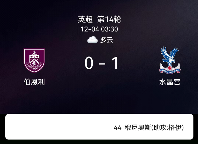 北京时间12月4日,2025-2026赛季英格兰足球超级联赛第14轮,伯恩利主场对阵水晶宫。第31分钟伯恩利染黄;第44分钟穆尼奥斯破门,0-1;第79分钟水晶宫染黄;双方各1黄;无红牌。最终比分,伯恩利0-1水晶宫。