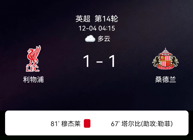 北京时间12月4日,2025-2026赛季英超第14轮,利物浦主场迎战桑德兰。第55分钟戈麦斯染黄;第67分钟塔勒比破门,0-1;第82分钟维尔茨破门,1-1;第90+2分钟桑德兰染黄;双方各1黄;无红牌。最终比分,利物浦1-1桑德兰。