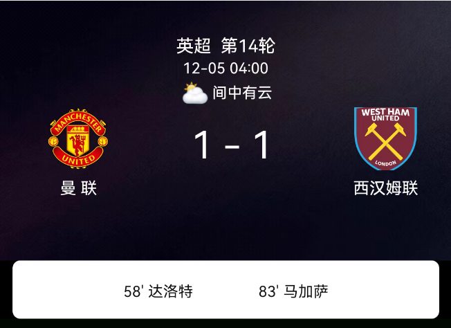 北京时间12月5日,2025-2026赛季英超第14轮,曼联主场迎战西汉姆联。第8分钟海文染黄;第37分钟迪乌夫染黄;第58分钟达洛特破门,1-0;第78分钟万-比萨卡染黄;第83分钟马加萨破门,1-1;曼联2黄、西汉姆联1黄;无红牌。最终比分,曼联1-1西汉姆联。