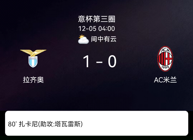 北京时间12月5日,意大利杯1/8决赛,拉齐奥迎战AC米兰。第3分钟帕夫洛维奇染黄;第80分钟扎卡尼破门,1-0;AC米兰1黄、拉齐奥无牌;无红牌。最终比分,拉齐奥1-0AC米兰。
