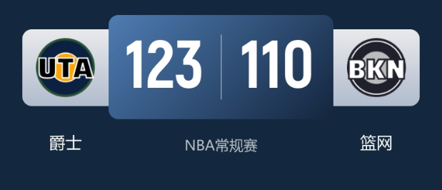 NBA战报:爵士123-110逆转篮网豪取2连胜末节42-20狂暴翻盘马尔卡宁30+8乔治29+10主导