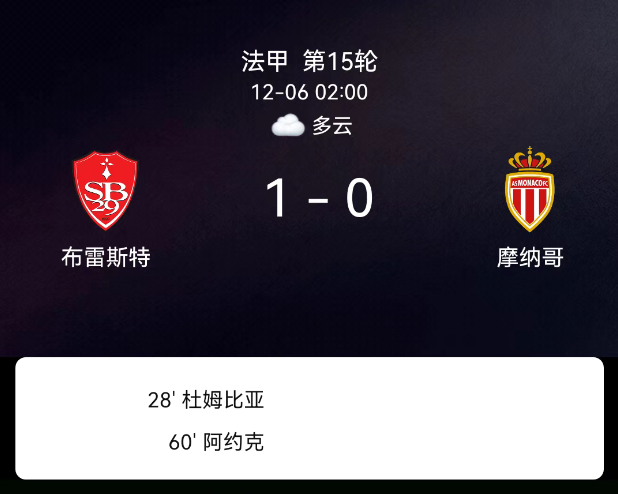 红黄牌情况:摩纳哥2张黄牌,布雷斯特1张红牌,十人作战的布雷斯特凭借早先进球守住胜果。