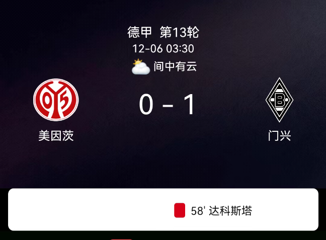 北京时间12月6日,2025-2026赛季德甲第13轮,美因茨主场对阵门兴格拉德巴赫。第42分钟美因茨首染黄;第58分钟丹尼-达科斯塔乌龙,0-1;第76分钟门兴染黄;双方各1黄;无红牌。最终比分,美因茨0-1门兴格拉德巴赫。
