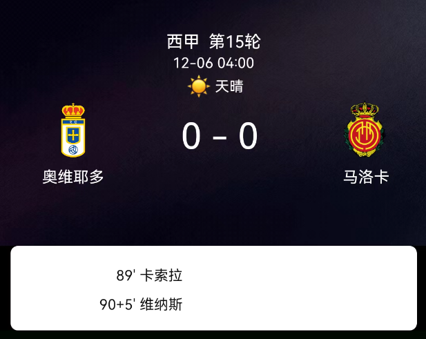 北京时间12月6日,2025-2026赛季西甲第15轮,皇家奥维耶多主场对阵马略卡。第38分钟皇家奥维耶多染黄;第65分钟马略卡染黄;第89分钟卡索拉染红;第90+5分钟比尼亚斯染红;皇家奥维耶多2黄2红、马略卡1黄;无进球。最终比分,皇家奥维耶多0-0马略卡。