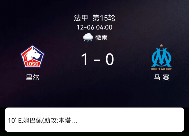 北京时间12月6日,2025-2026赛季法甲第15轮,里尔主场迎战马赛。第10分钟埃唐-姆巴佩破门,1-0;第35分钟马赛首染黄;第68分钟里尔染黄;双方各1黄;无红牌。最终比分,里尔1-0马赛。
