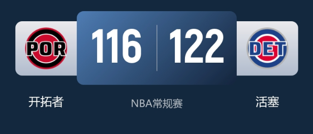 NBA战报:活塞122-116力克开拓者止颓末节10-0攻势翻盘康宁汉姆29+9+3断阿夫迪亚35+9+7空砍