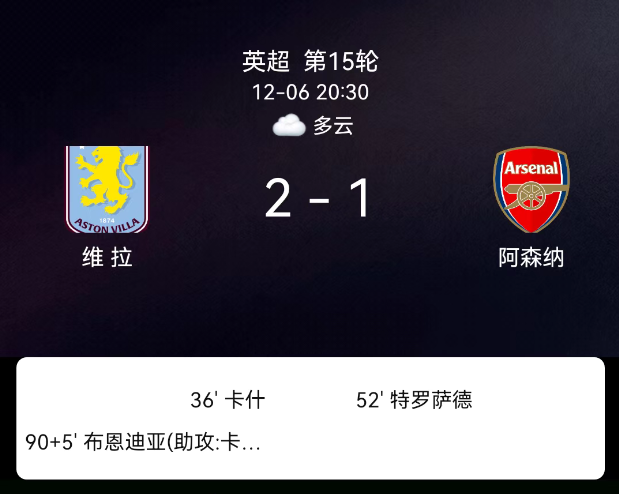 北京时间12月6日,2025-2026赛季英超第15轮,阿斯顿维拉主场迎战阿森纳。第36分钟卡什破门,0-1;第52分钟特罗萨德破门,1-1;第73分钟阿森纳染黄;第90+5分钟布恩迪亚破门,2-1;阿森纳1黄、维拉无牌;无红牌。最终比分,阿斯顿维拉2-1阿森纳。