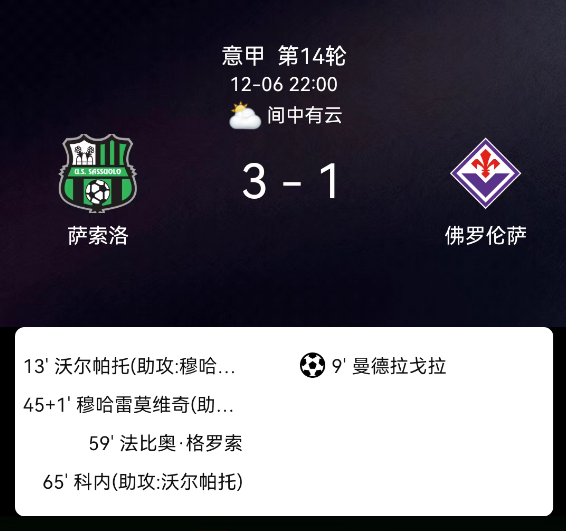 北京时间12月6日,2025-2026赛季意甲第14轮,萨索洛主场迎战佛罗伦萨。第9分钟曼德拉戈拉点射,0-1;第14分钟沃尔帕托破门,1-1;第38分钟萨索洛染黄;第45+1分钟穆哈雷莫维奇破门,2-1;第58分钟佛罗伦萨染黄;第63分钟格罗索染红;第65分钟伊斯梅尔-科内破门,3-1;双方各1黄,佛罗伦萨1红。最终比分,萨索洛3-1佛罗伦萨。