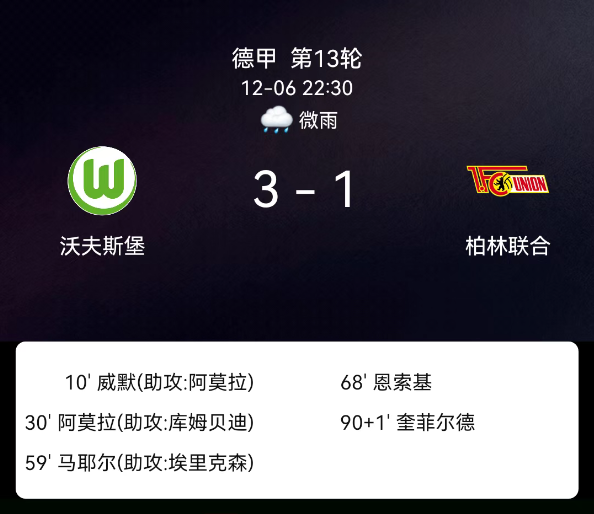 北京时间12月6日,2025-2026赛季德甲第13轮,沃尔夫斯堡主场对阵柏林联合。第10分钟维默尔破门,1-0;第22分钟沃尔夫斯堡染黄;第30分钟阿穆拉破门,2-0;第45+2分钟埃里克森染黄;第59分钟马耶尔破门,3-0;第68分钟恩索基破门,1-3;第74分钟马耶尔染黄;第79分钟布尔克染黄;沃尔夫斯堡4黄、柏林联合1黄;无红牌。最终比分,沃尔夫斯堡3-1柏林联合。