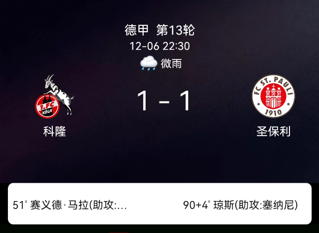 北京时间12月6日,2025-2026赛季德甲第13轮,科隆主场迎战圣保利。第51分钟赛义德-马拉破门,1-0;第90+4分钟杰德-琼斯破门,1-1;双方无红黄牌。最终比分,科隆1-1圣保利。