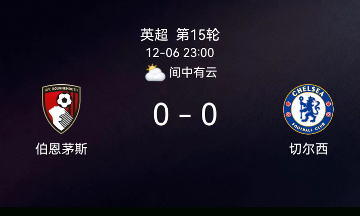北京时间12月6日,2025-2026赛季英超第15轮,伯恩茅斯主场对阵切尔西。第5分钟塞门约破门无效,第32分钟德拉普伤退,第36分钟埃万尼尔松失空门,切尔西2黄、伯恩茅斯无牌;无红牌。最终比分,伯恩茅斯0-0切尔西。