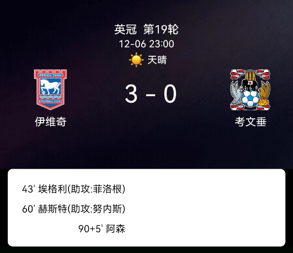 北京时间12月6日,2025-2026赛季英冠第19轮,伊普斯维奇主场迎战考文垂。第43分钟埃格利破门,1-0;第60分钟乔治-赫斯特破门,2-0;第90+5分钟伊万-阿松破门,3-0;伊普斯维奇5黄、考文垂2黄;无红牌。最终比分,伊普斯维奇3-0考文垂。