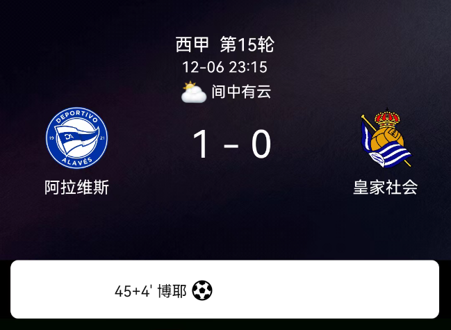 北京时间12月6日,2025-2026赛季西甲第15轮,阿拉维斯主场迎战皇家社会。第45+4分钟卢卡斯-博耶点射破门,1-0;双方各1黄;无红牌。最终比分,阿拉维斯1-0皇家社会。