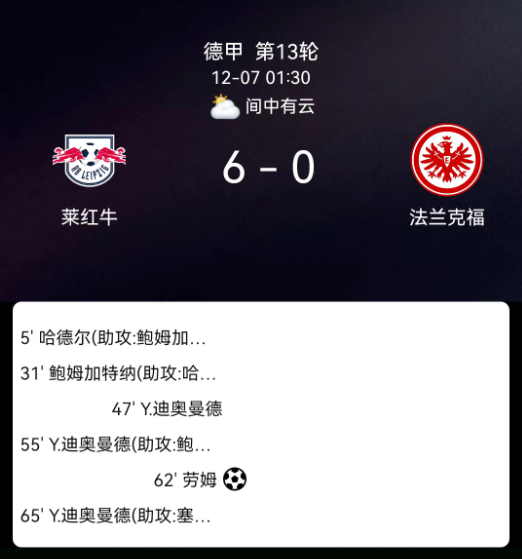 北京时间12月7日,2025-2026赛季德甲第13轮,RB莱比锡主场迎战法兰克福。第5分钟哈德破门,1-0;第31分钟鲍姆加特纳破门,2-0;第47分钟迪奥曼德破门,3-0;第55分钟迪奥曼德双响,4-0;第62分钟劳姆点射,5-0;第65分钟迪奥曼德戴帽,6-0;双方无红黄牌。最终比分,RB莱比锡6-0法兰克福。