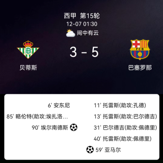 北京时间12月7日,2025-2026赛季西甲第15轮,皇家贝蒂斯主场迎战巴塞罗那。第6分钟安东尼破门,0-1;第12分钟费兰破门,1-1;第14分钟费兰双响,2-1;第22分钟阿尔蒂米拉染黄;第32分钟巴尔德吉破门,3-1;第39分钟费兰戴帽,4-1;第48分钟赫拉德-马丁染黄;第59分钟亚马尔点射,5-1;第84分钟迭戈-略伦特破门,5-2;第90分钟库乔点射,5-3;共6张黄牌无红牌。最终比分,皇家贝蒂斯3-5巴塞罗那。