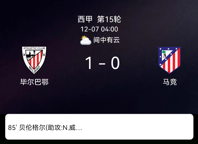 北京时间12月7日,2025-2026赛季西甲第15轮,毕尔巴鄂竞技主场迎战马德里竞技。第12分钟马竞球员染黄;第14分钟豪雷吉萨尔染黄;第20分钟德-加拉雷塔染黄;第28分钟拉波尔特染黄;第85分钟贝伦格尔破门,1-0;第90+4分钟科克染黄;共5张黄牌无红牌。最终比分,毕尔巴鄂竞技1-0马德里竞技。
