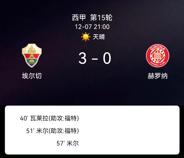 北京时间12月7日,2025-2026赛季西甲第15轮,埃尔切主场迎战赫罗纳。第40分钟巴莱拉破门,1-0;第51分钟拉法-米尔破门,2-0;第57分钟拉法-米尔双响,3-0;双方各2黄;无红牌。最终比分,埃尔切3-0赫罗纳。