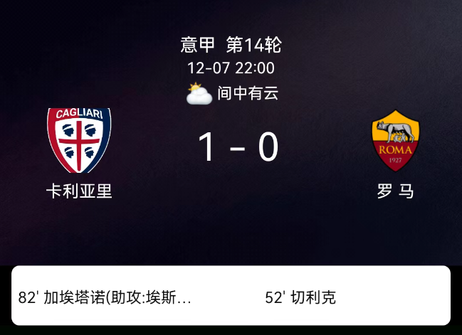 北京时间12月7日,2025-2026赛季意甲第14轮,卡利亚里主场迎战罗马。第52分钟切利克染红;第78分钟卡利亚里球员染黄、埃尔莫索染黄;第83分钟加埃塔诺破门,1-0;第83分钟加埃塔诺染黄;卡利亚里2黄、罗马1黄1红。最终比分,卡利亚里1-0罗马。