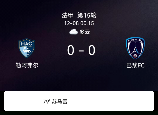北京时间12月8日,2025-2026赛季法甲第15轮,勒阿弗尔主场迎战巴黎FC。第78分钟巴黎FC球员染黄;第79分钟伊萨-苏马雷罚丢点球;第89分钟卡马拉染黄;勒阿弗尔无黄、巴黎FC2黄;无红牌。最终比分,勒阿弗尔0-0巴黎FC。