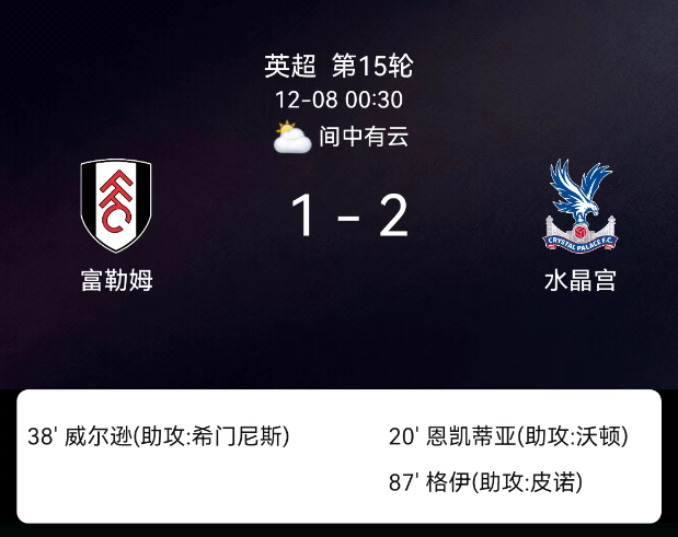 北京时间12月8日,2025-2026赛季英超第15轮,富勒姆主场迎战水晶宫。第20分钟恩凯蒂亚破门,0-1;第38分钟哈里-威尔逊破门,1-1;第87分钟格伊破门,1-2;双方均无红黄牌。最终比分,富勒姆1-2水晶宫。