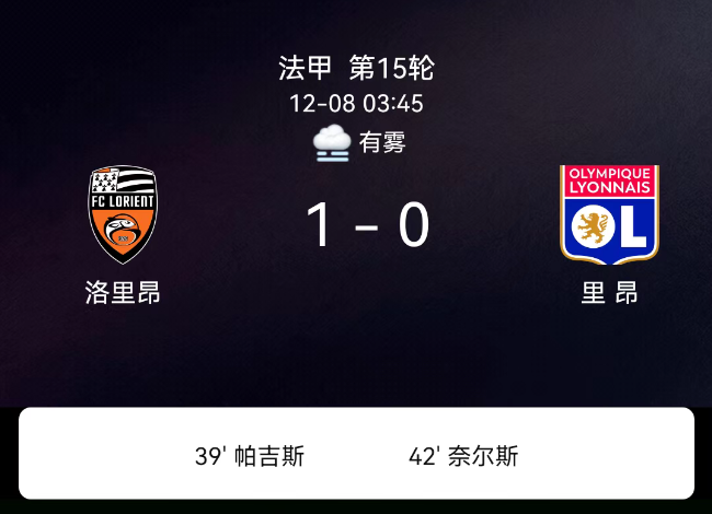 北京时间12月8日,2025-2026赛季法甲第15轮,洛里昂主场迎战里昂。第39分钟帕吉破门,1-0;第42分钟梅特兰-奈尔斯染红;洛里昂2黄、里昂1黄1红。最终比分,洛里昂1-0里昂。
